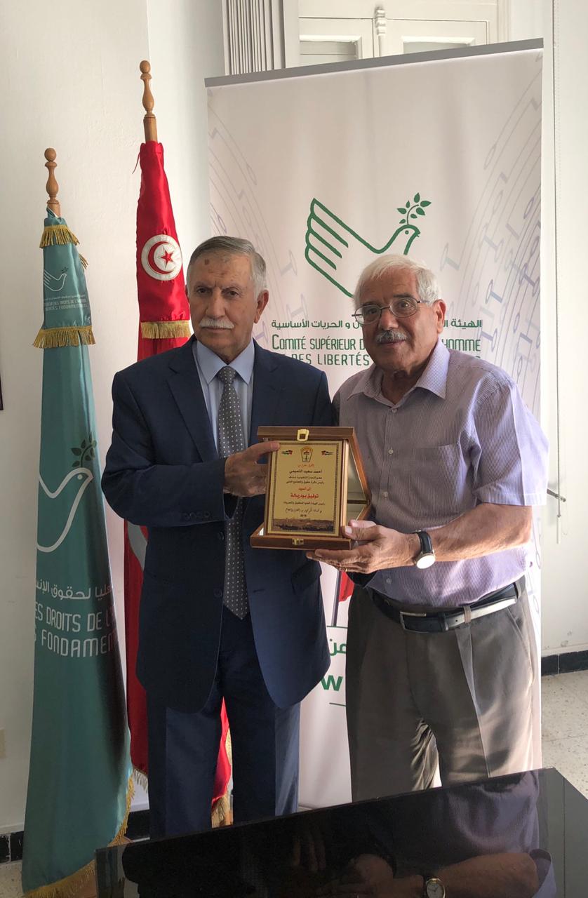 التقي السيد احمد التميمي عضو اللجنة التنفيذية لمنظمة التحرير ورئيس دائرة حقوق الانسان والمجتمع المدني في تونس، السيد توفيق بودربالة رئيس الهيئة العليا لحقوق الانسان التونسية.