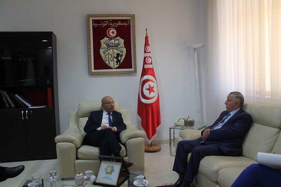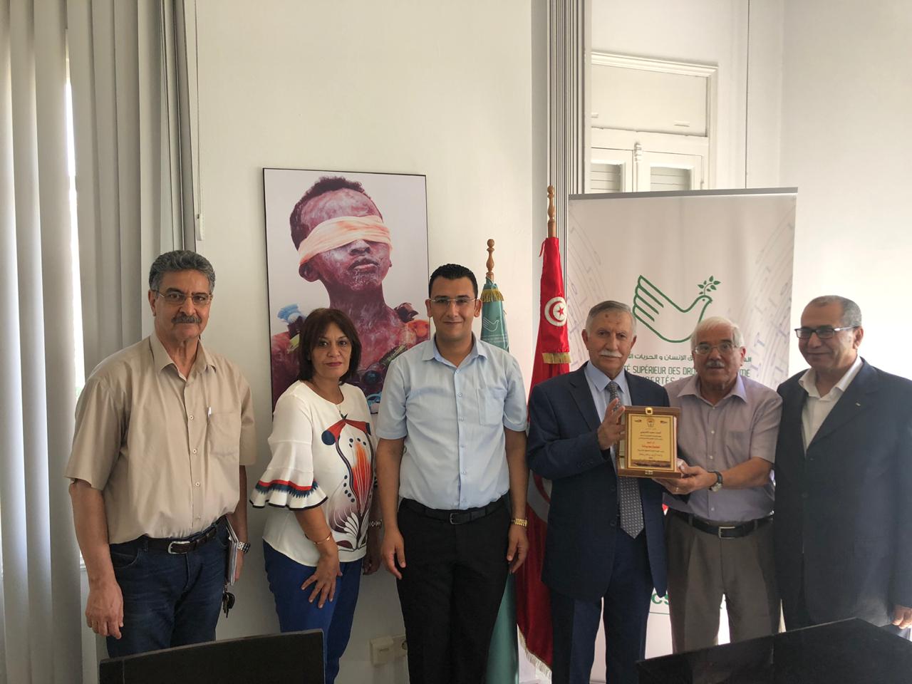 التقي السيد احمد التميمي عضو اللجنة التنفيذية لمنظمة التحرير ورئيس دائرة حقوق الانسان والمجتمع المدني في تونس، السيد توفيق بودربالة رئيس الهيئة العليا لحقوق الانسان...